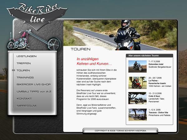 Konzeption und Gestaltung von Bike Rider Live. Betreiber eines Online-Shops und Anbieter von Motorattouren.