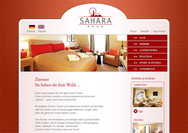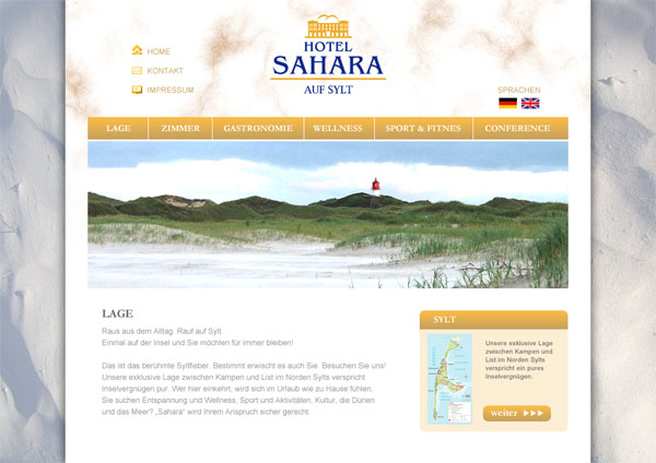Gestaltung des Internettauftritts in Verbindung mit einer ganzheitlichen Corporate Design Entwicklung für das Hotel Sahara auf Sylt.